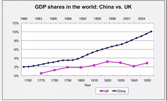 我們重新計算后,得出了上面的那條虛線。歷史上的中國只有一次高峰,那就是1600年,當(dāng)時我們中國的經(jīng)濟(jì)活動量占到了全球的將近38%,從此開始,中國經(jīng)濟(jì)在全球中的比重逐步下滑,再到1820年出現(xiàn)斷崖式下降。
