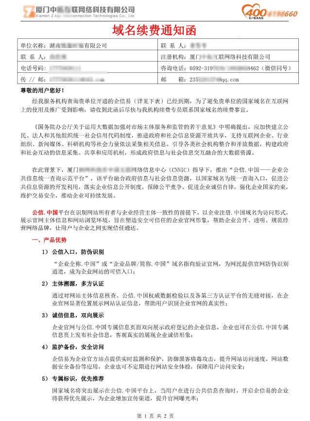2、我方通知客戶都只會是以前為你一對一的服務專員才會與貴公司對接辦理網(wǎng)站續(xù)費事務,所以陌生人員與您聯(lián)系說域名網(wǎng)站到期的都請謹防被騙。